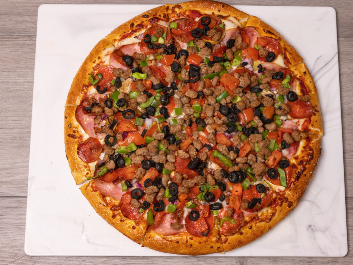 Pizza sauce, mozzarella cheese, Canadian ham, bacon, pepperoni, red onions, mushrooms, green peppers, tomatoes, black olives, & beef.