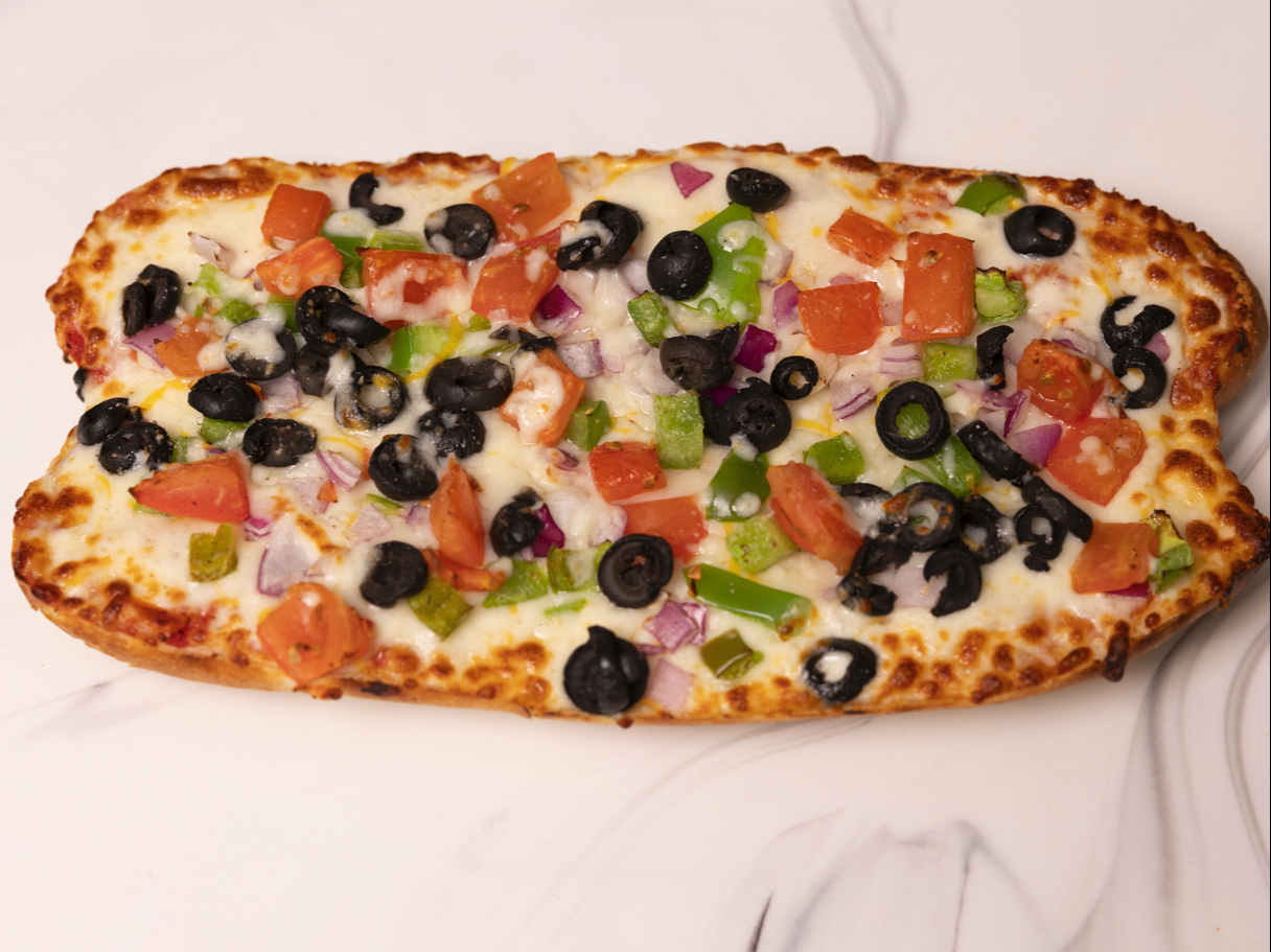 Red onions, green peppers, tomatoes, black olives, pizza sauce & mozzarella cheese.