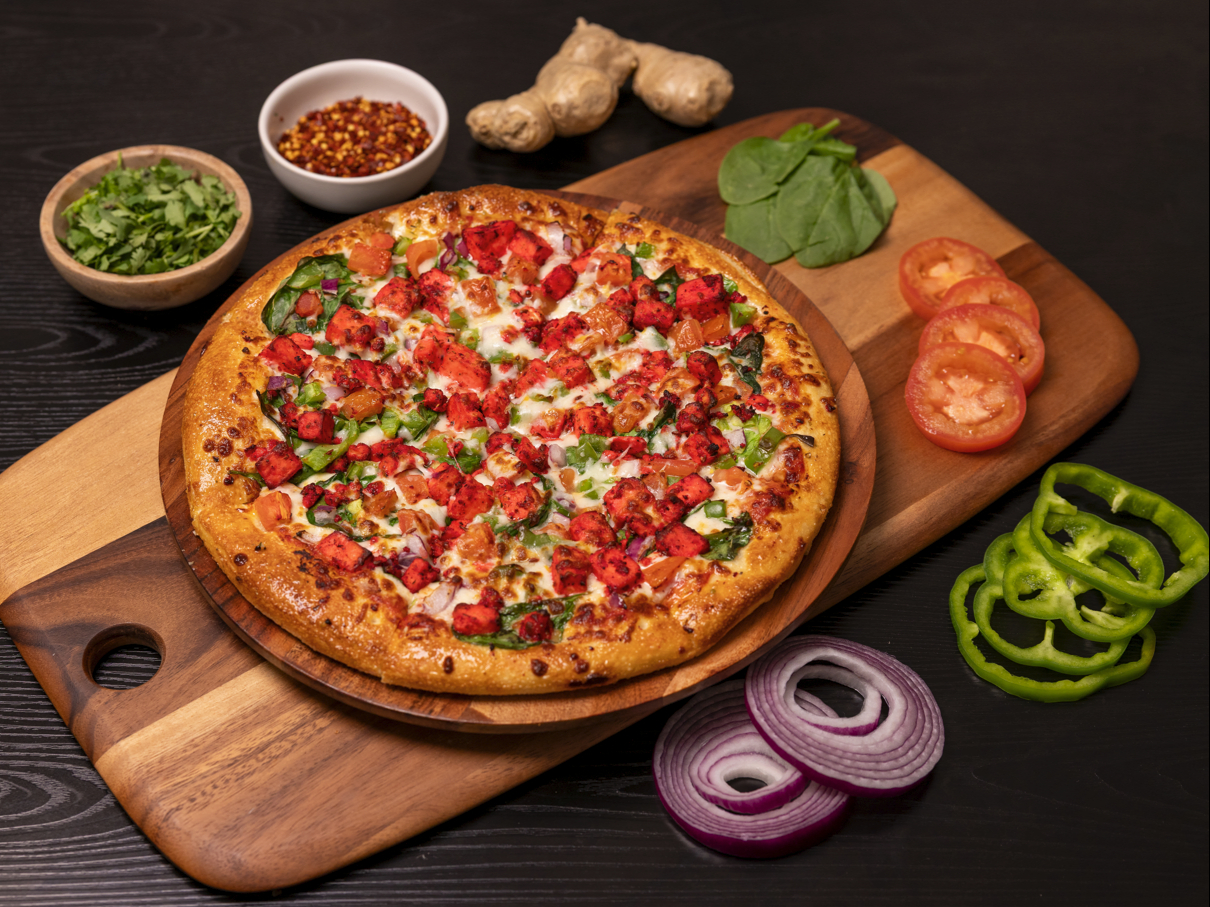 Pizza sauce, Tandori paneer, red onions, green peppers, tomatoes & mozzarella cheese.