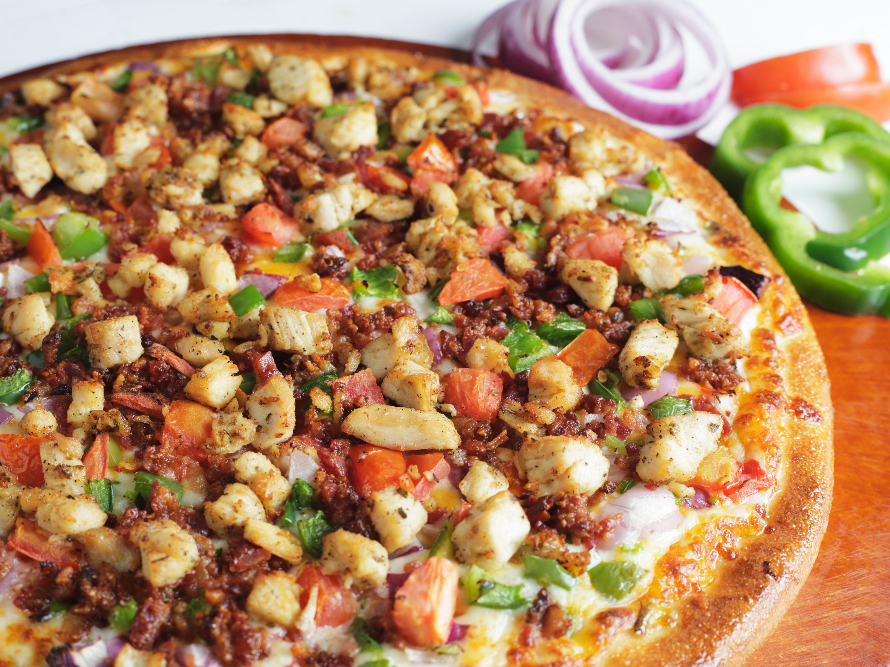 pizza sauce, halal chicken, red onions, green peppers, tomatoes, and mozzarella cheese