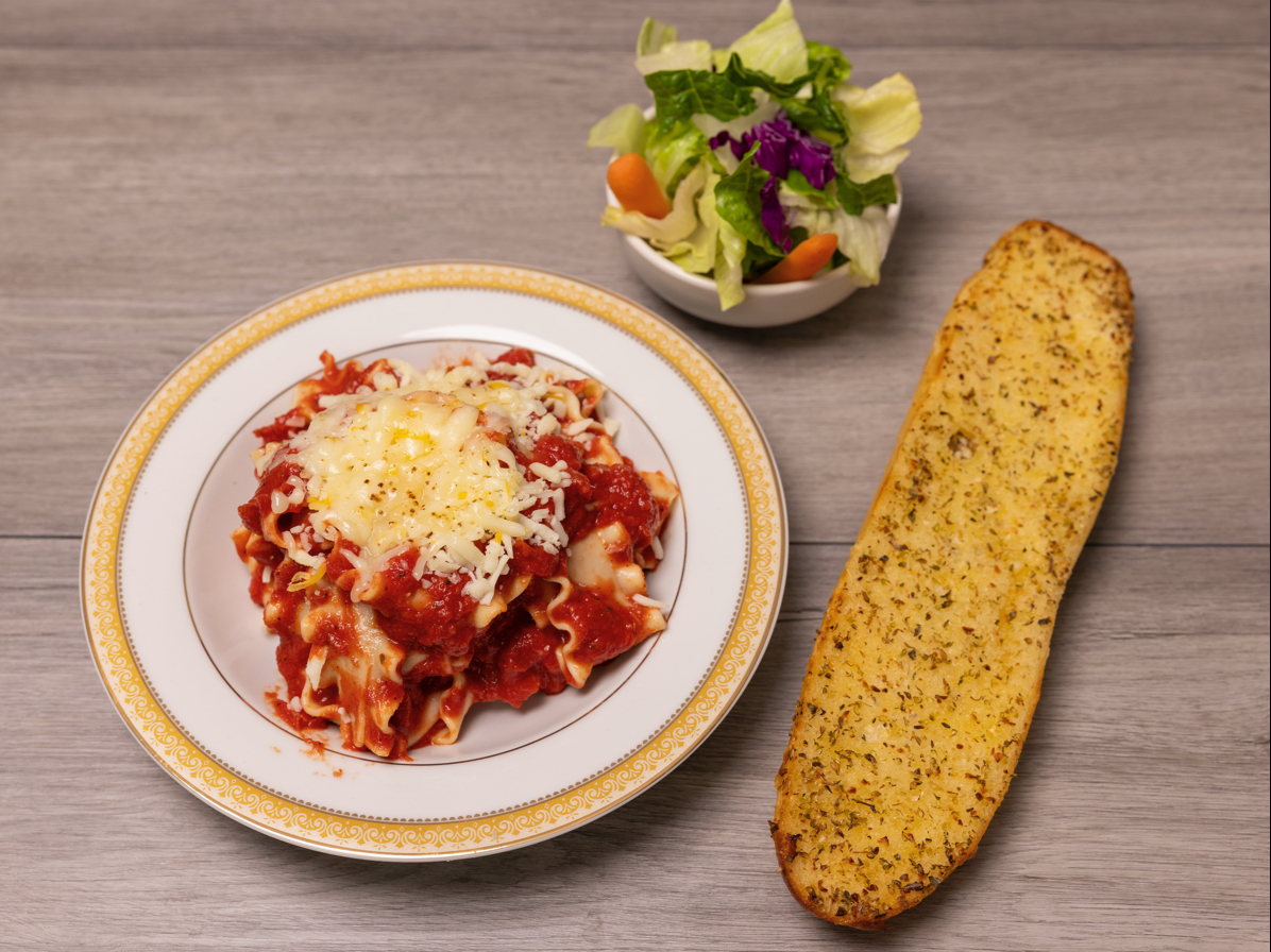 Lasagna noodles in marinara sauce & mozzarella cheese. Pasta is served with a small green salad and one piece of garlic bread on side.