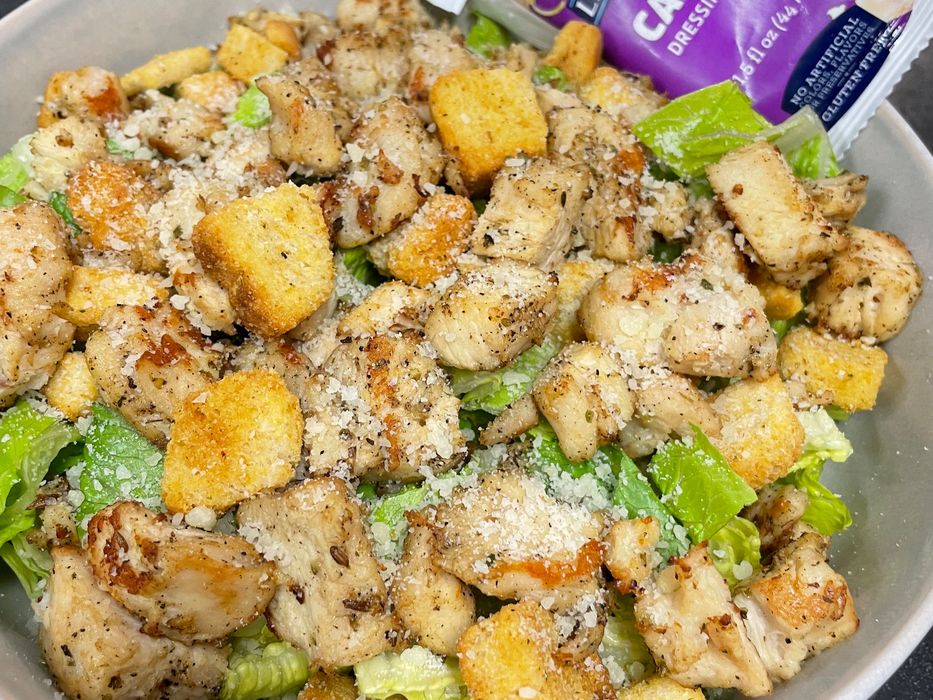 Grilled chicken, fresh romaine lettuce, grated parmesan cheese & croutons.
