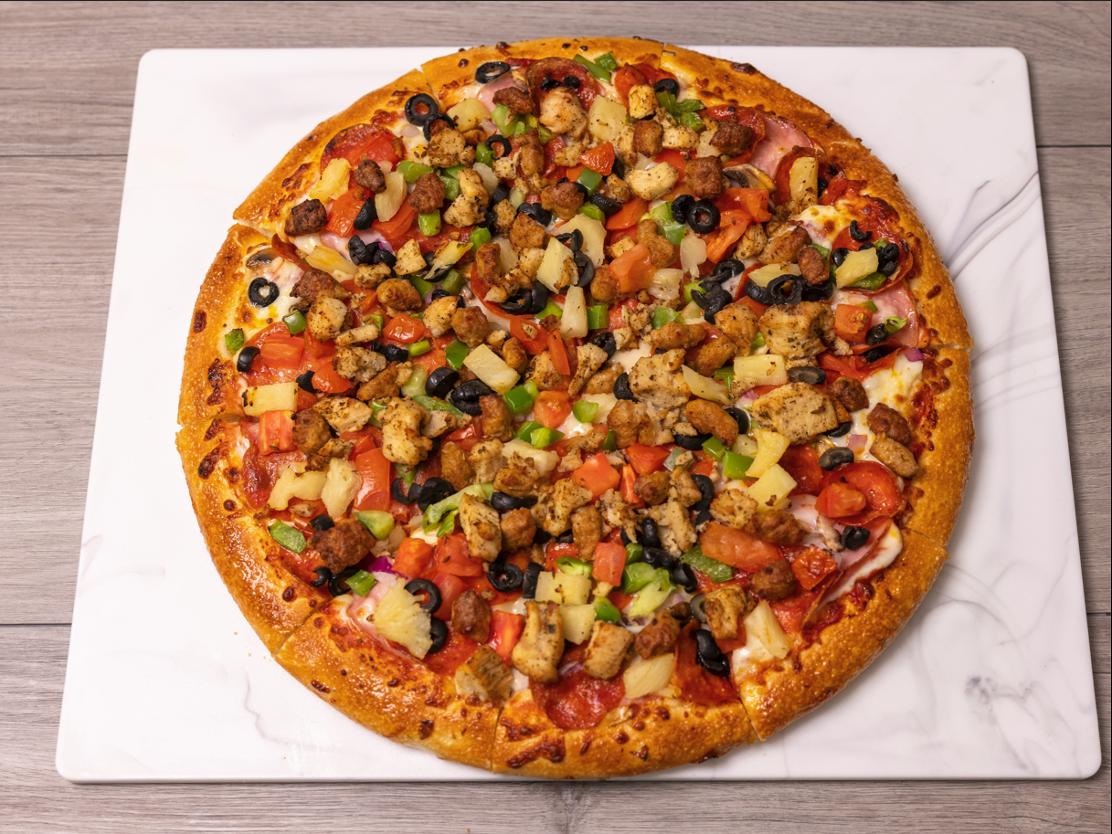 Pizza sauce, mozzarella cheese, red onions, mushrooms, green peppers, tomatoes, pineapple, black olives, Canadian ham, pepperoni, Italian sausage, & chicken.