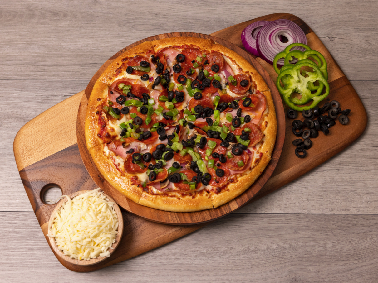 Pizza sauce, pepperoni, Canadian ham, mushrooms, green peppers, black olives & mozzarella cheese.