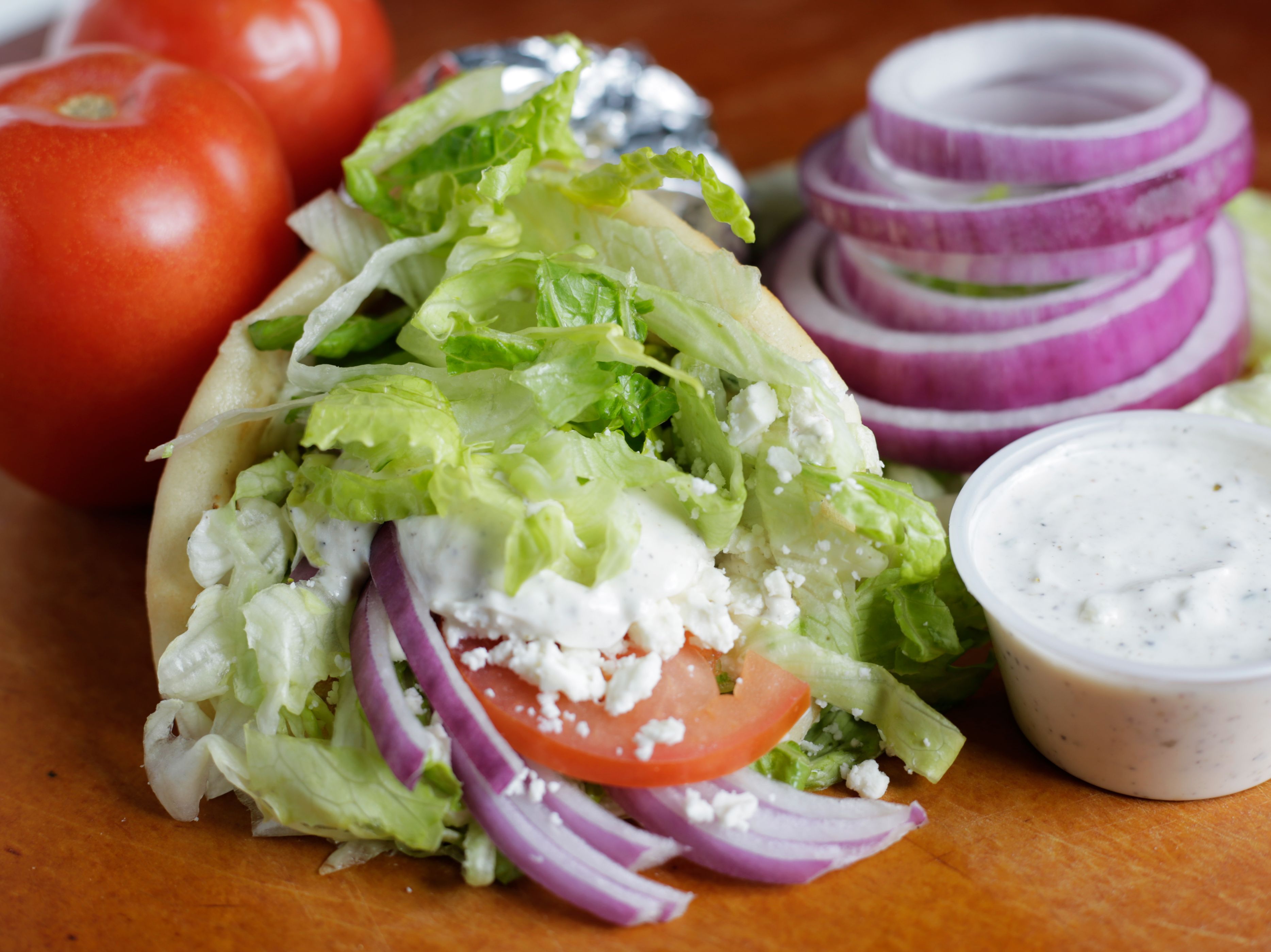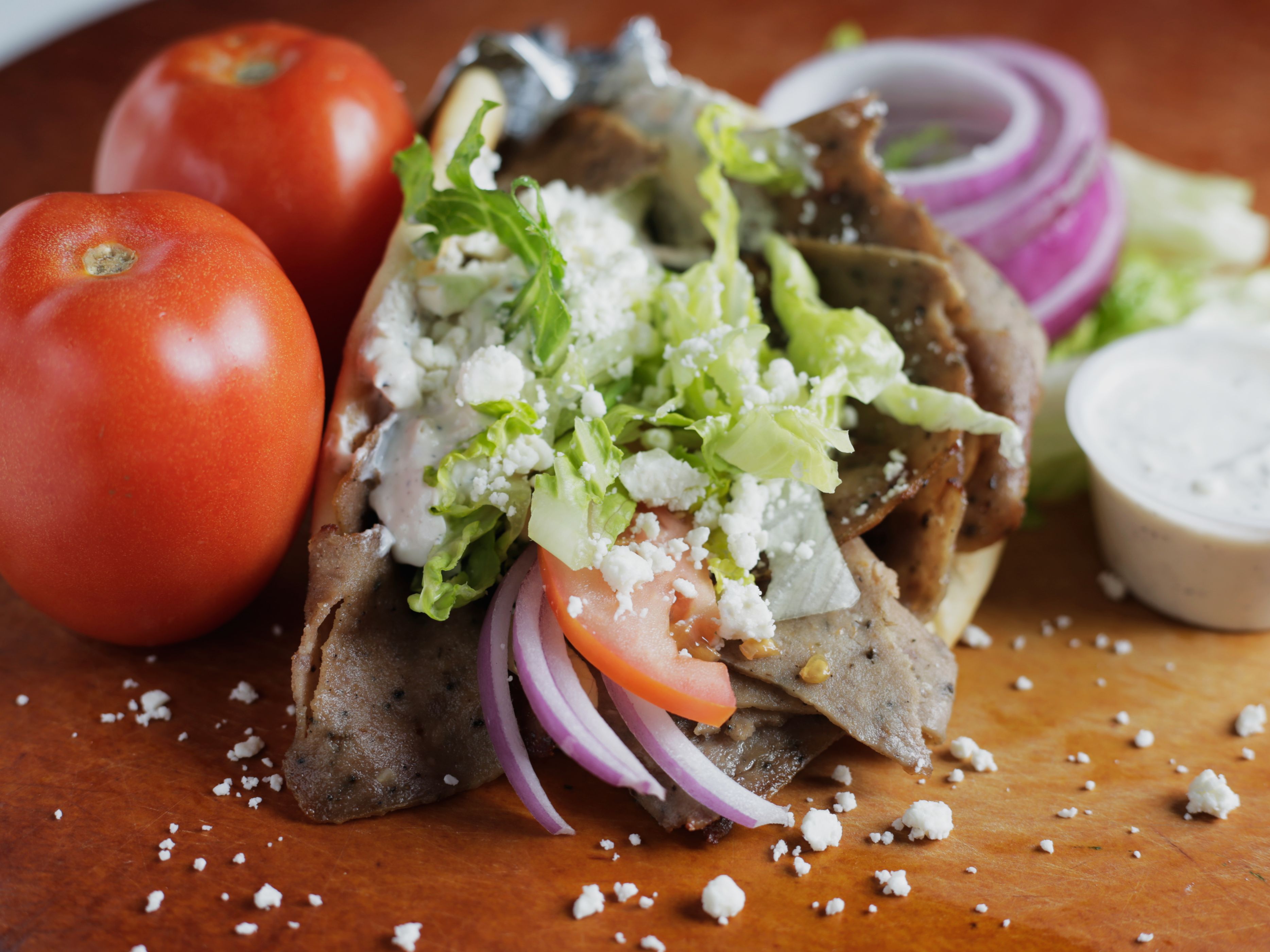 Pita bread, lettuce, tomatoes, red onions, beef-lamb mix meat served with Tzatziki sauce.