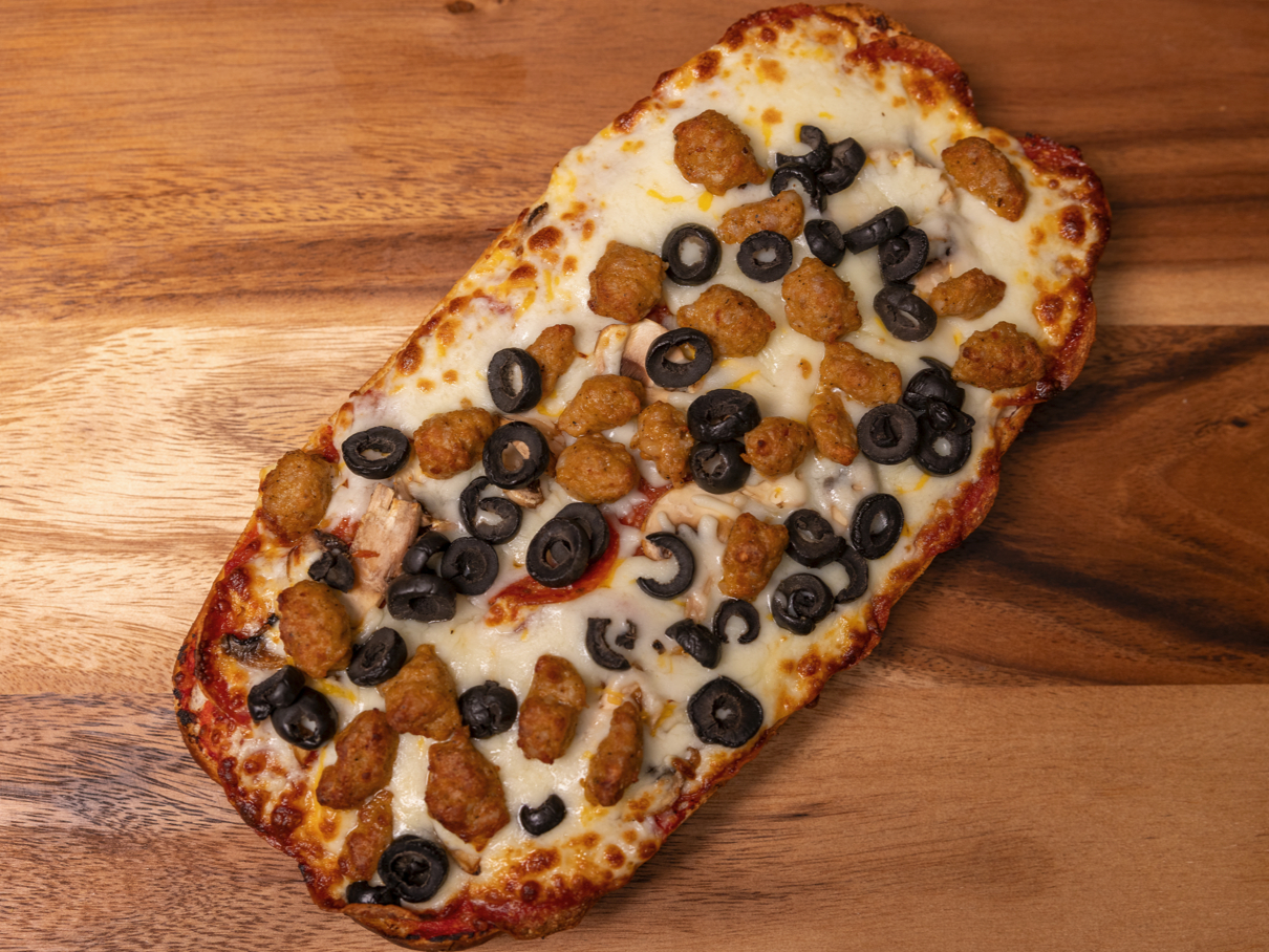 Loaded with pepperoni, Italian sausage, black olives & mozzarella cheese.