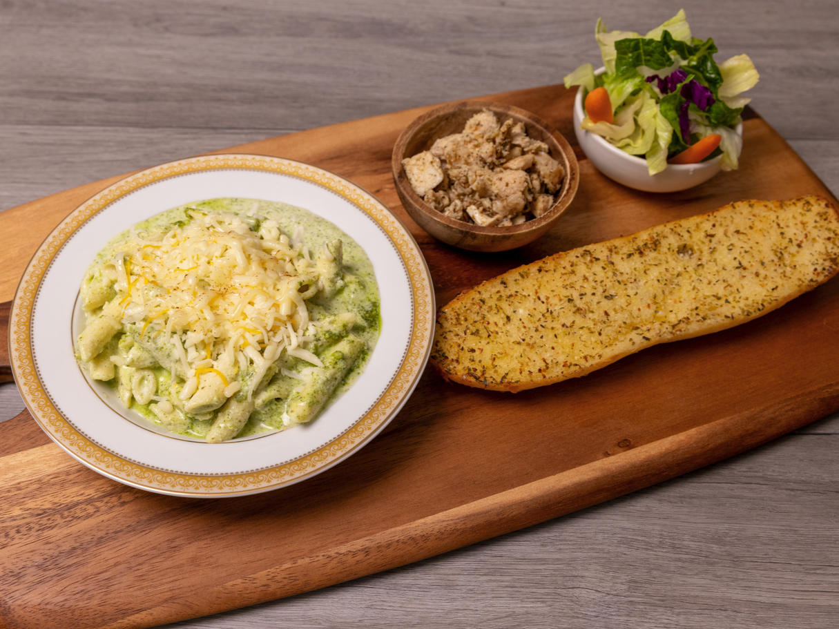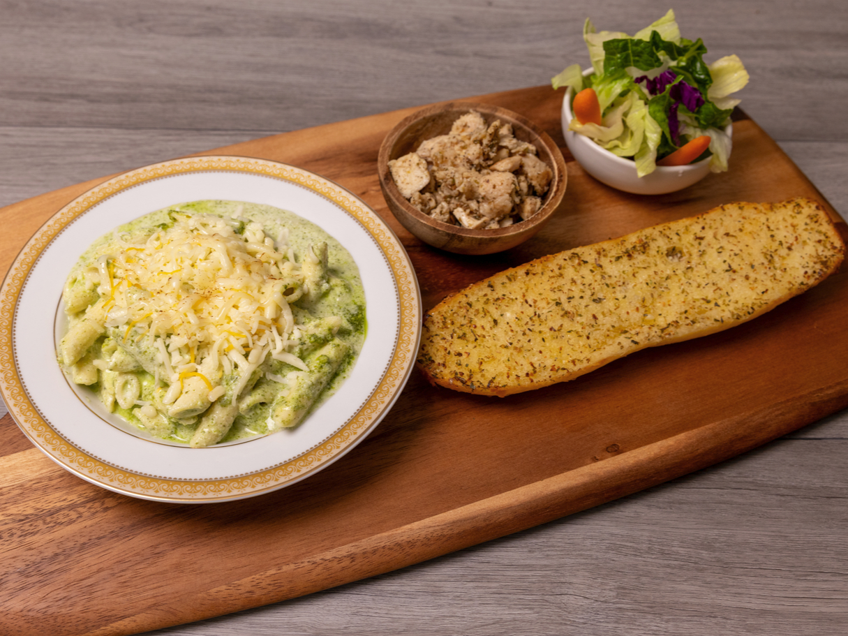 Penne noodles in white alfredo sauce, basil pesto sauce, served with grilled chicken & topped with mozzarella cheese, Pasta is served with one small green salad and one piece of garlic bread on side.