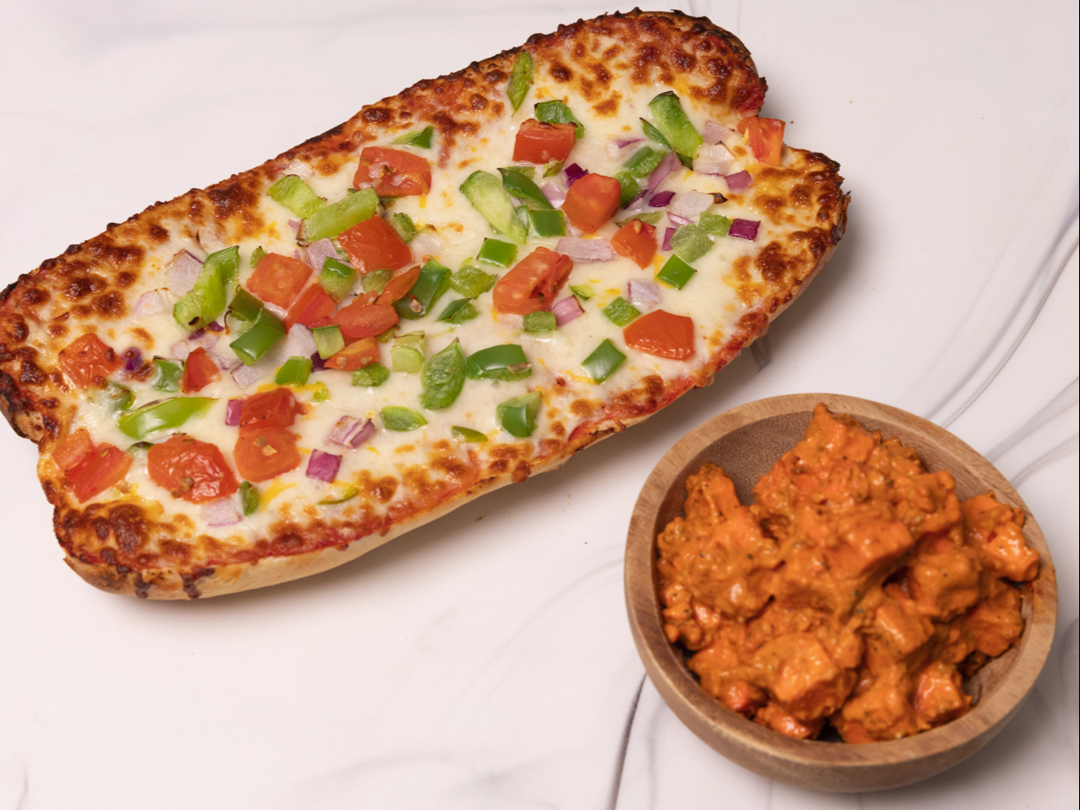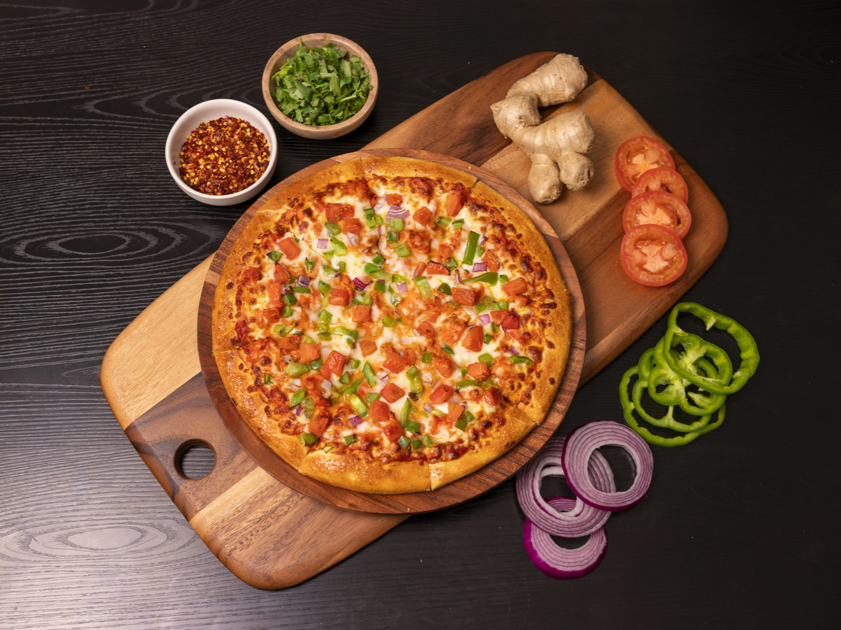 Pizza sauce, Butter chicken, red onions, green peppers, tomatoes & mozzarella cheese.