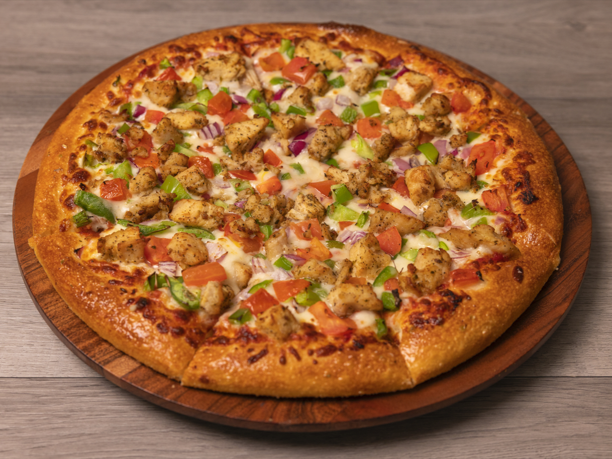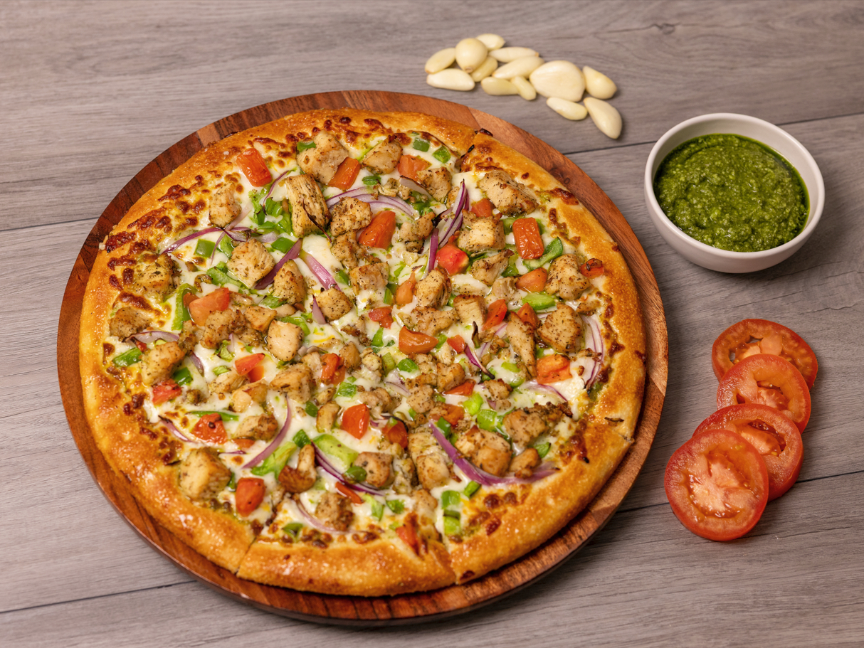 pizza sauce, halal tandori chicken, red onions, green peppers, tomatoes, and mozzarella cheese