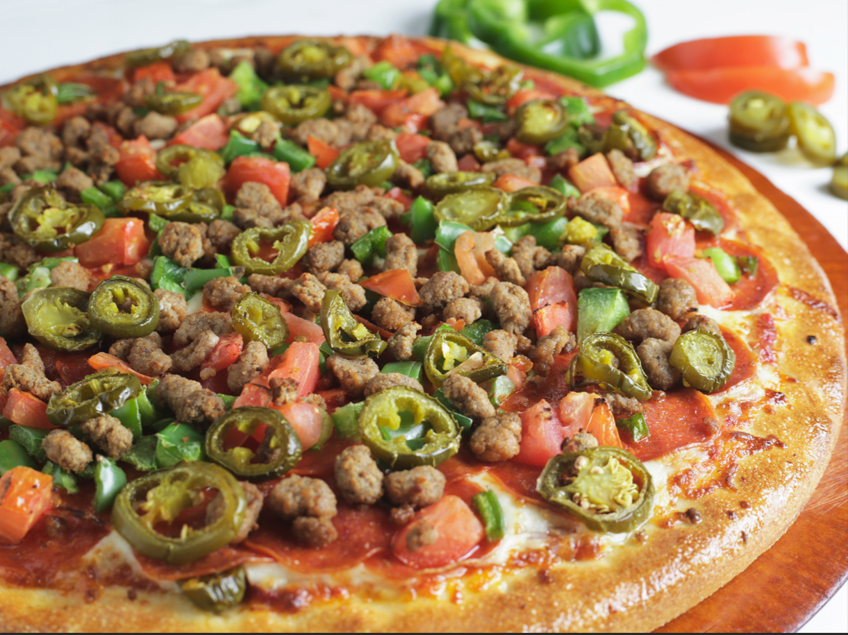 Pizza sauce, mozzarella cheese, pepperoni, red onions, green peppers, tomatoes, jalapenos, & beef.