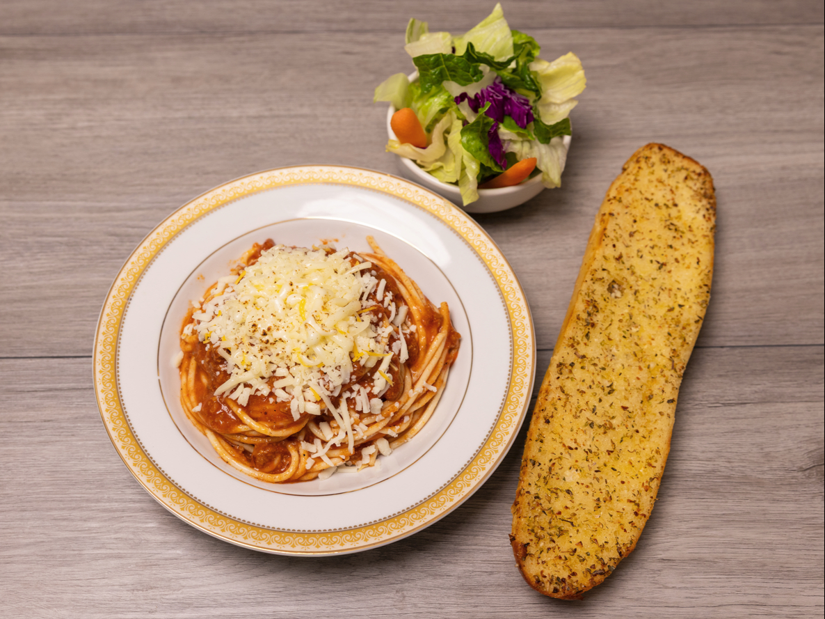 Spaghetti noodles in marinara sauce & mozzarella cheese. Pasta is served with a small green salad and one piece of garlic bread on side.