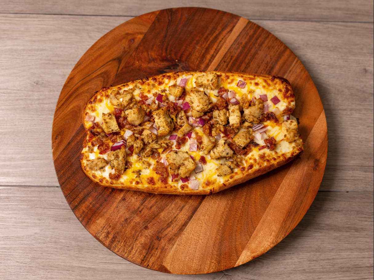 Grilled chicken, bacon, red onions, parmesan, cheddar & mozzarella cheeses and ranch sauce.