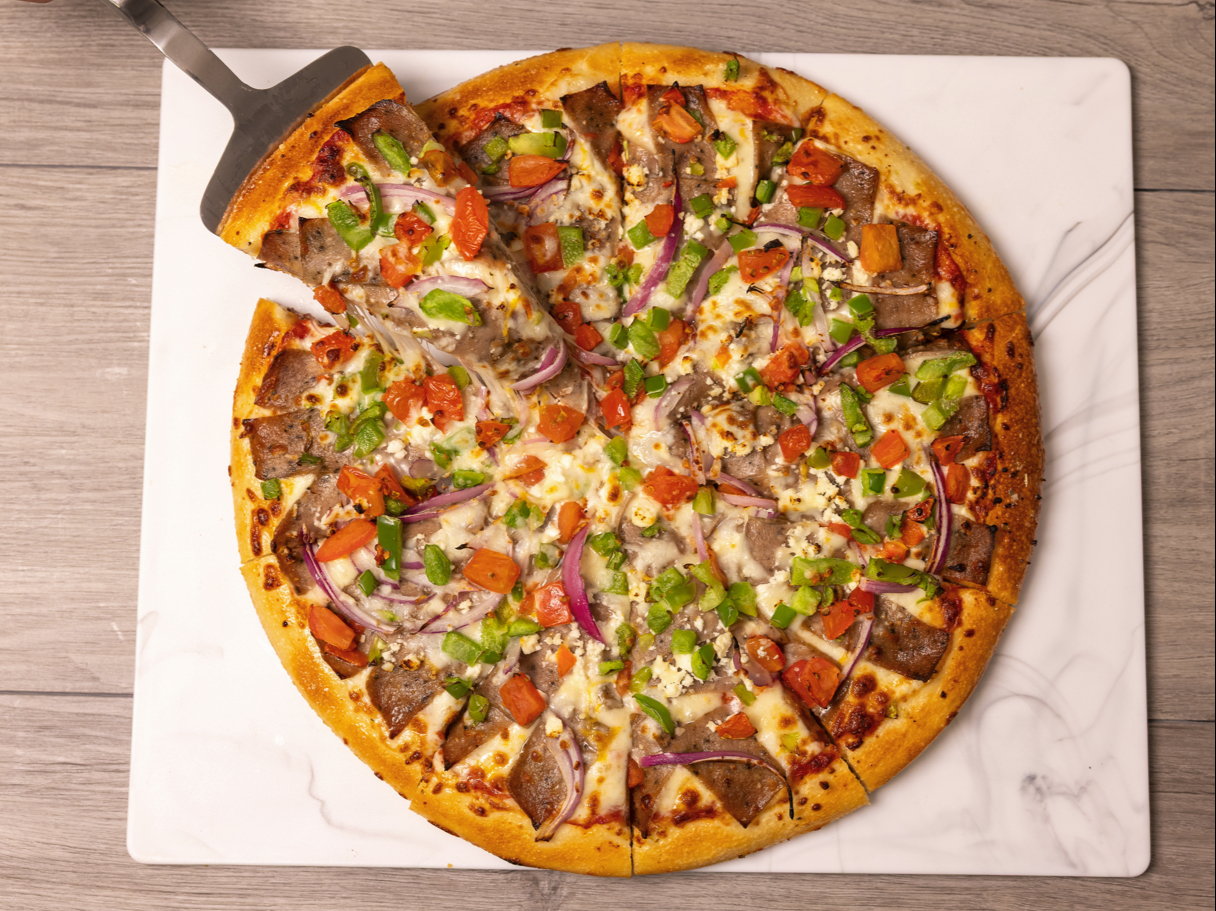 Pizza sauce, mozzarella cheese, feta cheese, sliced red onions, green peppers, tomatoes, & beef-lamb mixed gyro meat.