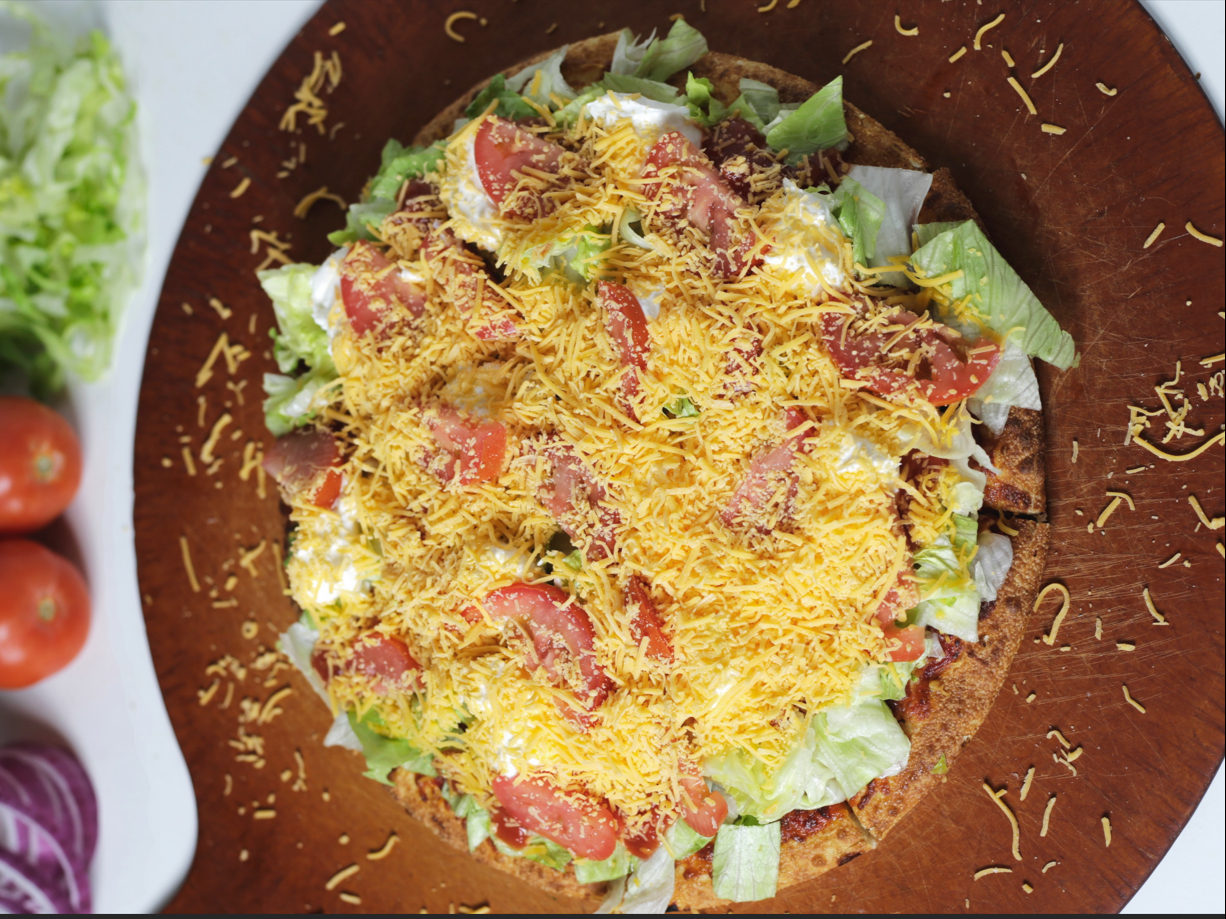 Pizza sauce, mozzarella cheese, red onions, beef, fresh lettuce, fresh tomatoes, sour cream, salsa sauce, & cheddar cheese.