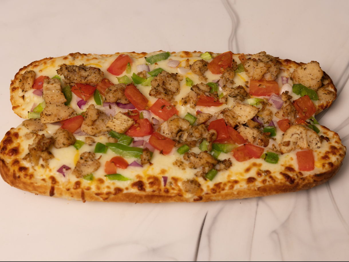 Grilled chicken, red onions, green peppers, tomatoes, pizza sauce & mozzarella cheese.