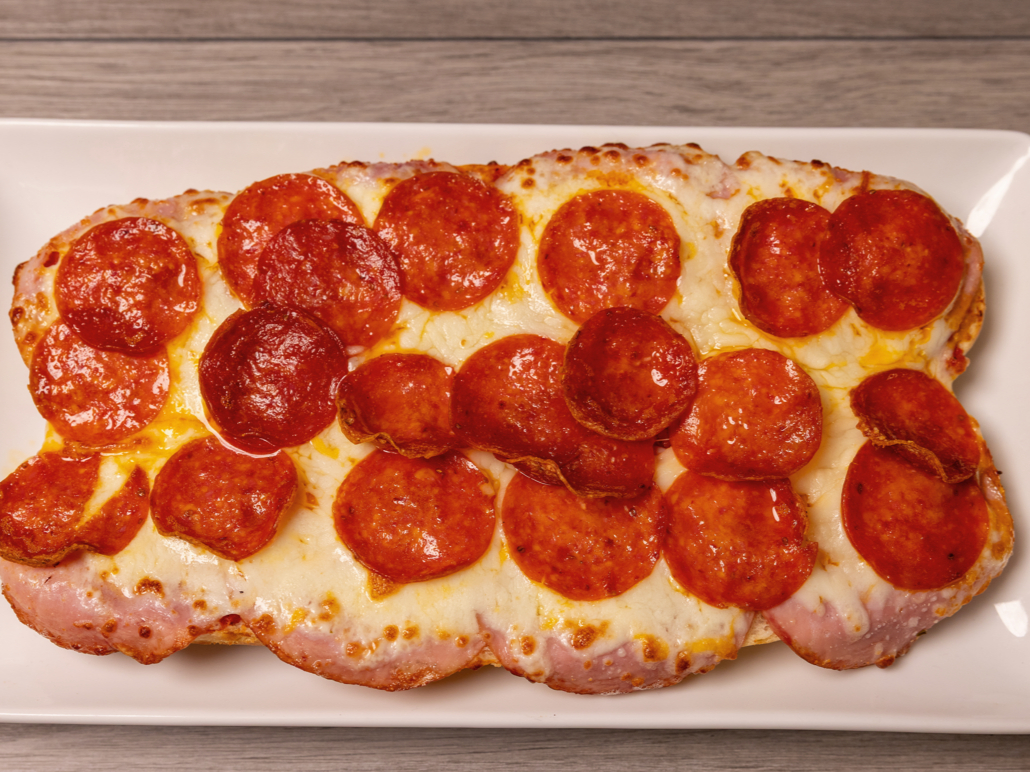 Pepperoni, ham, pizza sauce & mozzarella cheese.
