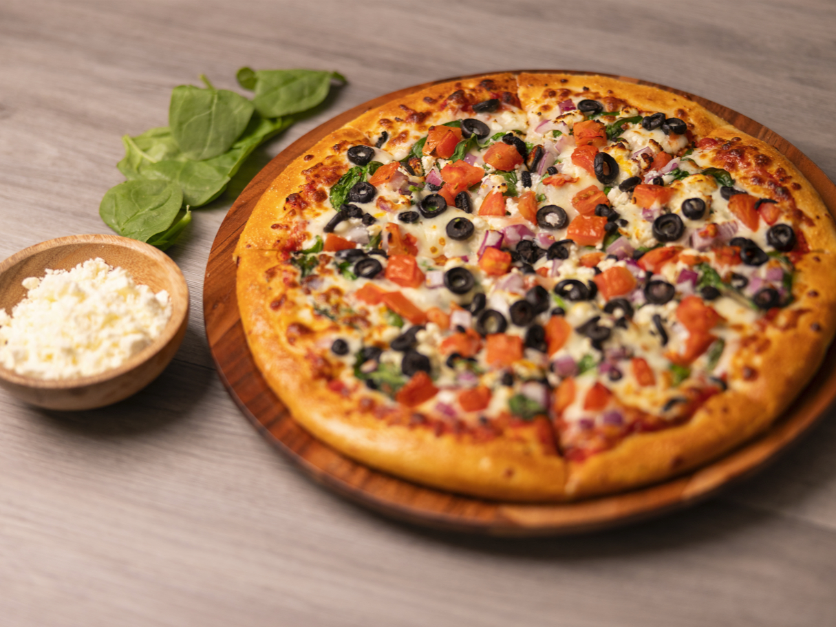 Pizza sauce, spinach, black olives, feta cheese, garlic, tomatoes & mozzarella cheese.