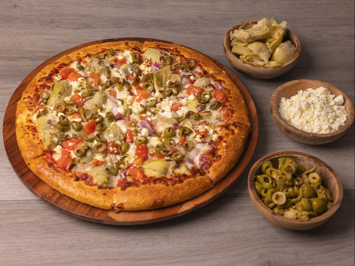 Pizza sauce, feta cheese, mozzarella cheese, red onions, green olives, artichoke hearts, & tomatoes.