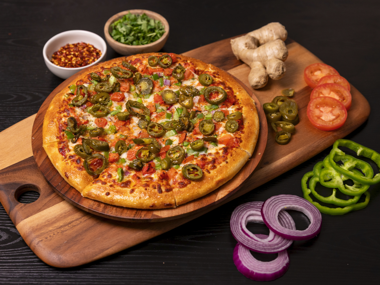 Pizza sauce, red onions, green peppers, tomatoes, jalapenos, mozzarella cheese & karahi paneer.