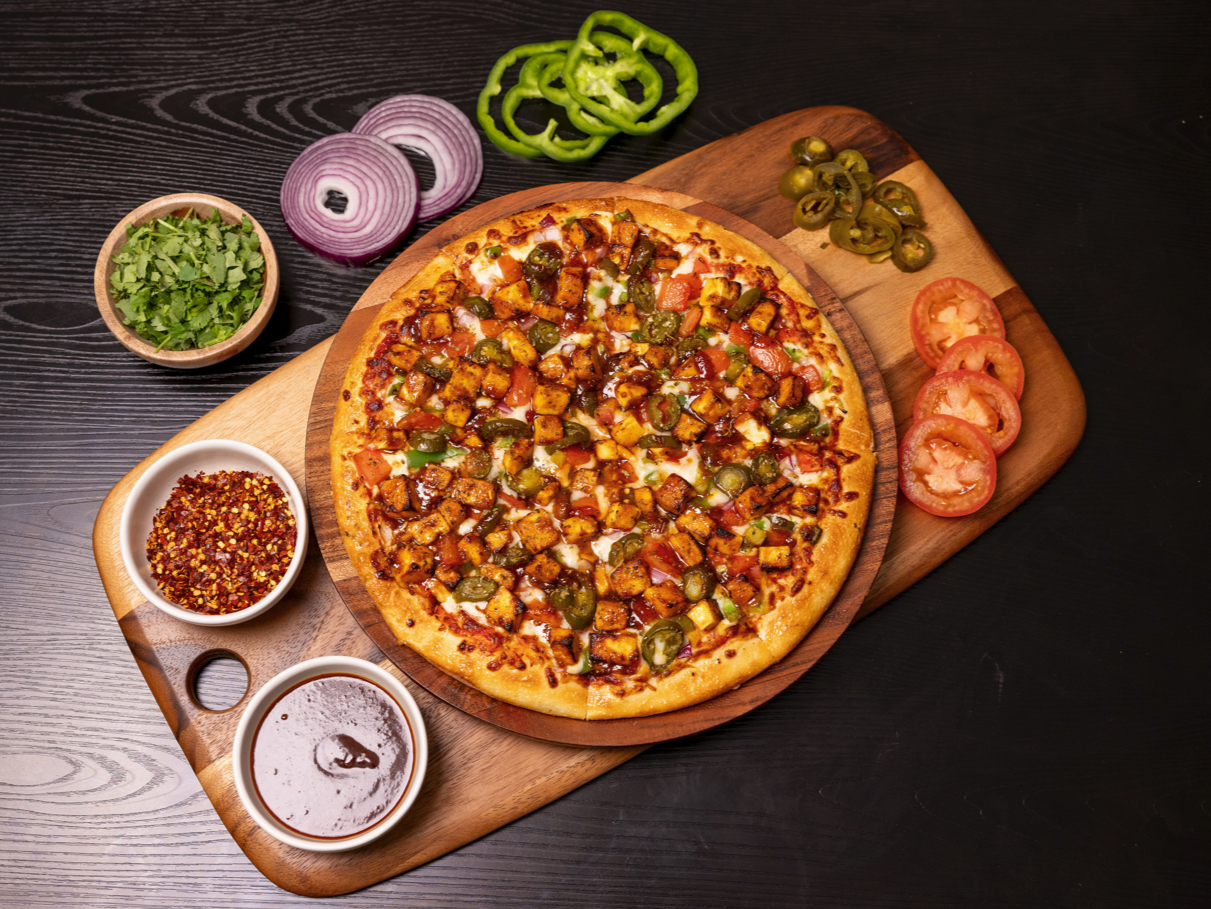 Pizza sauce, red onions, green peppers, tomatoes, jalapenos, mozzarella cheese & butter paneer.
