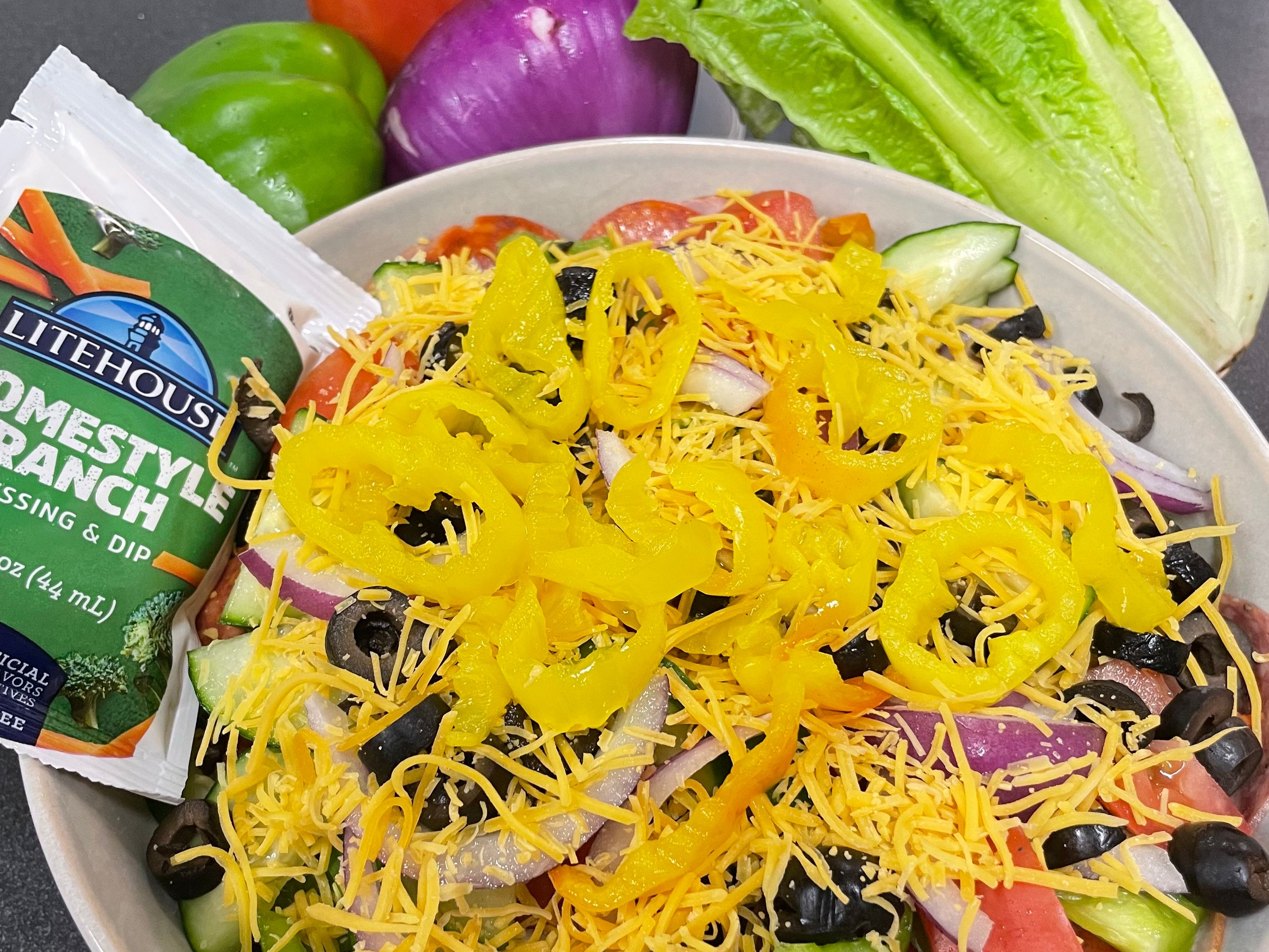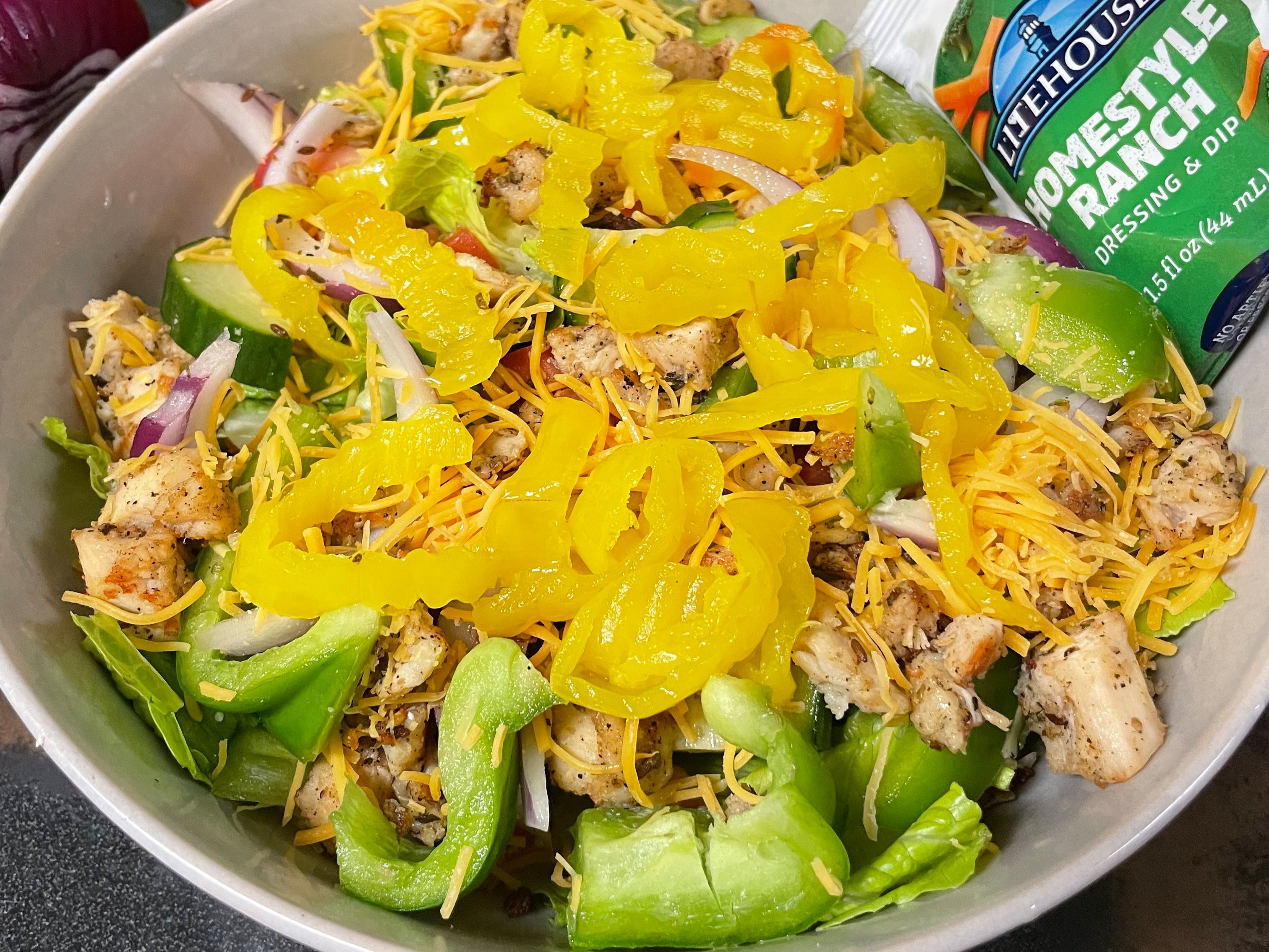 Grilled chicken, romaine lettuce, green peppers, tomatoes, cucumber, red onions, banana peppers & cheddar cheese.