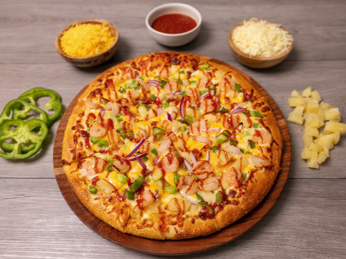 Pizza sauce, mozzarella cheese, cheddar cheese, red onions, green peppers, pineapple, baby shrimp with BBQ sauce drizzled on top.