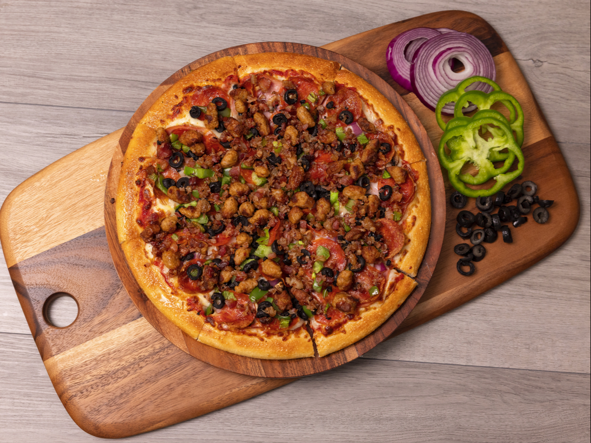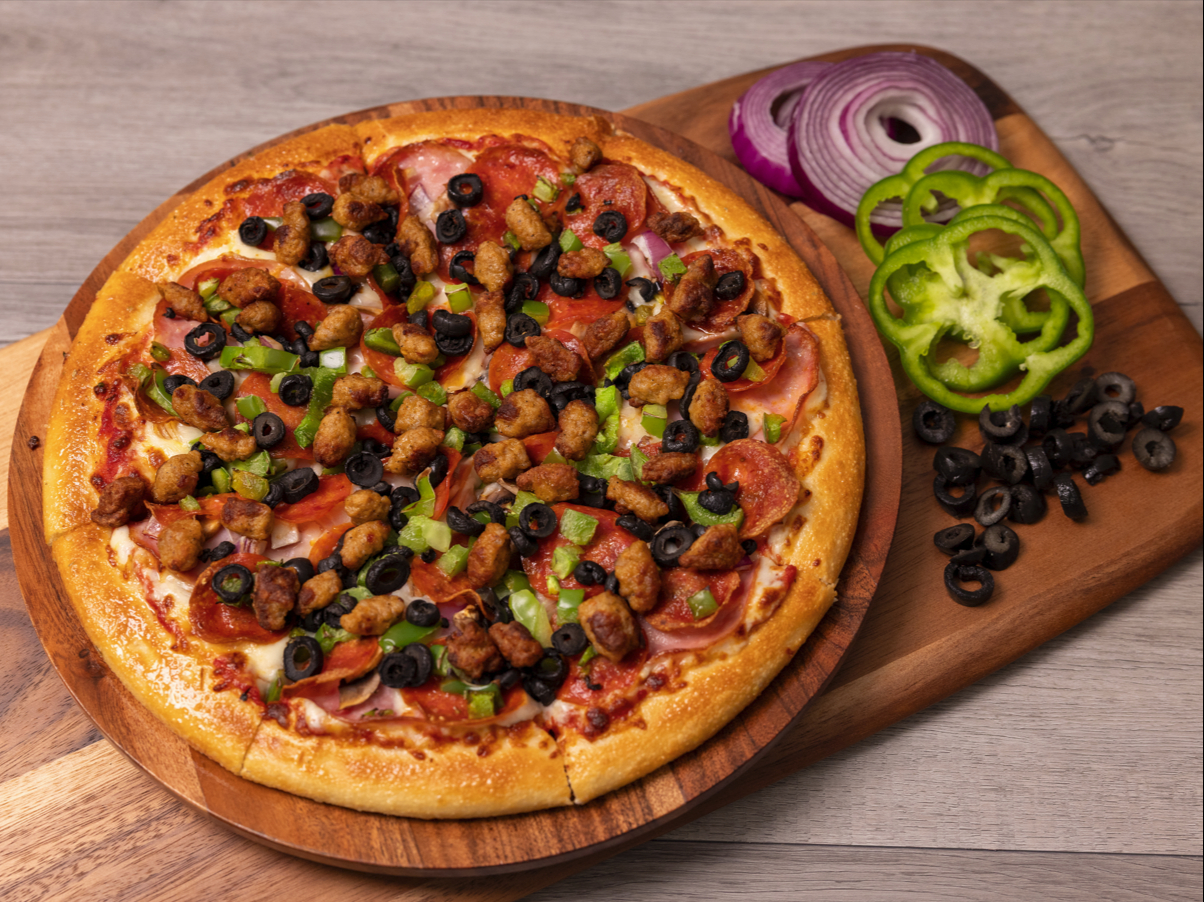 Pizza sauce, mozzarella cheese, red onions, mushrooms, bacon, pepperoni, Italian sausage, green peppers, & black olives.