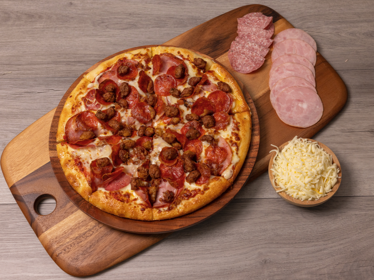 Pizza sauce, pepperoni, Canadian ham, Italian sausage, bacon & mozzarella cheese.