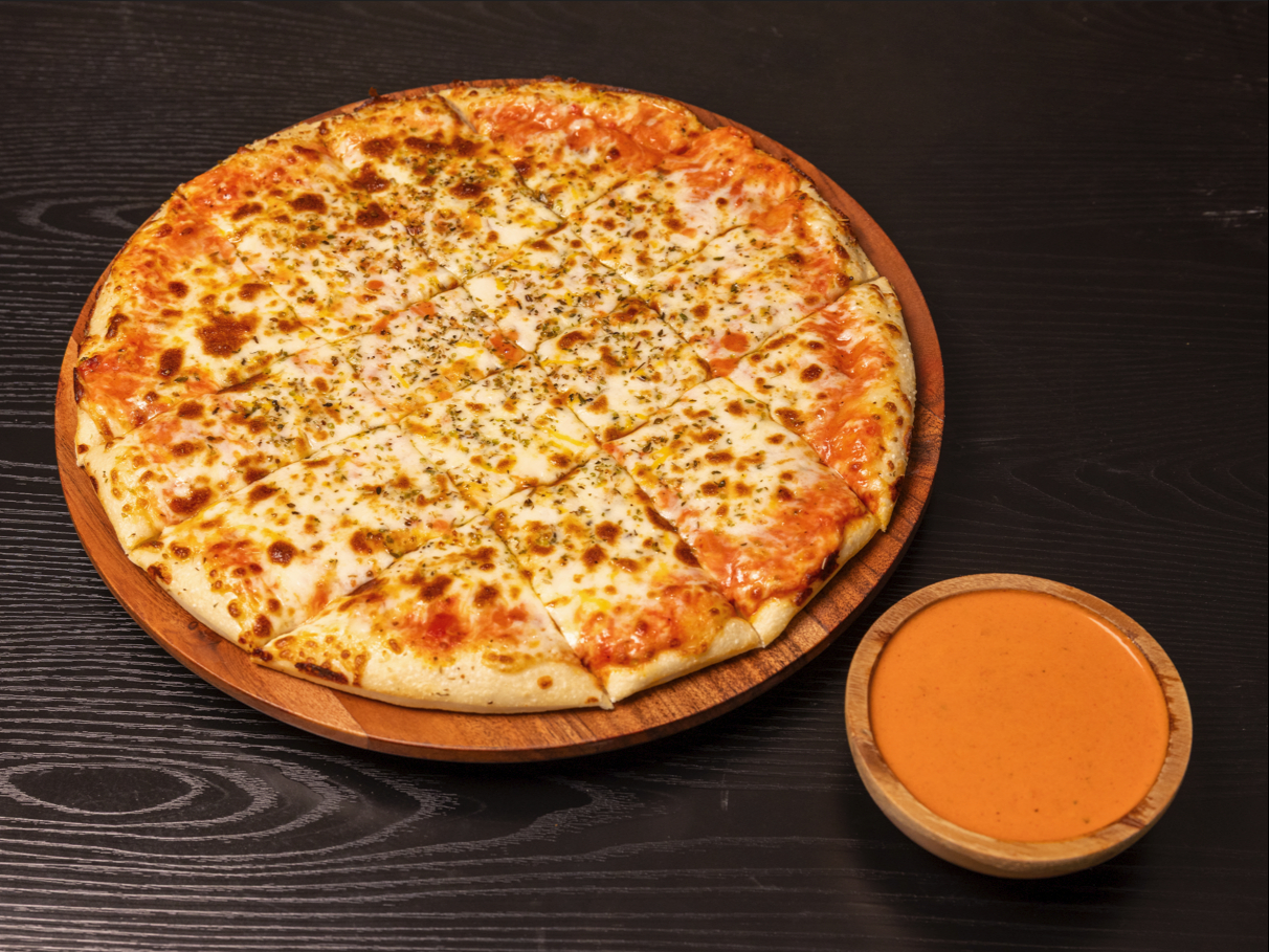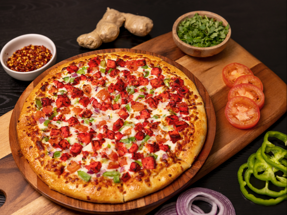 Pizza sauce, Tandori chicken, red onions, green peppers, tomatoes & mozzarella cheese.