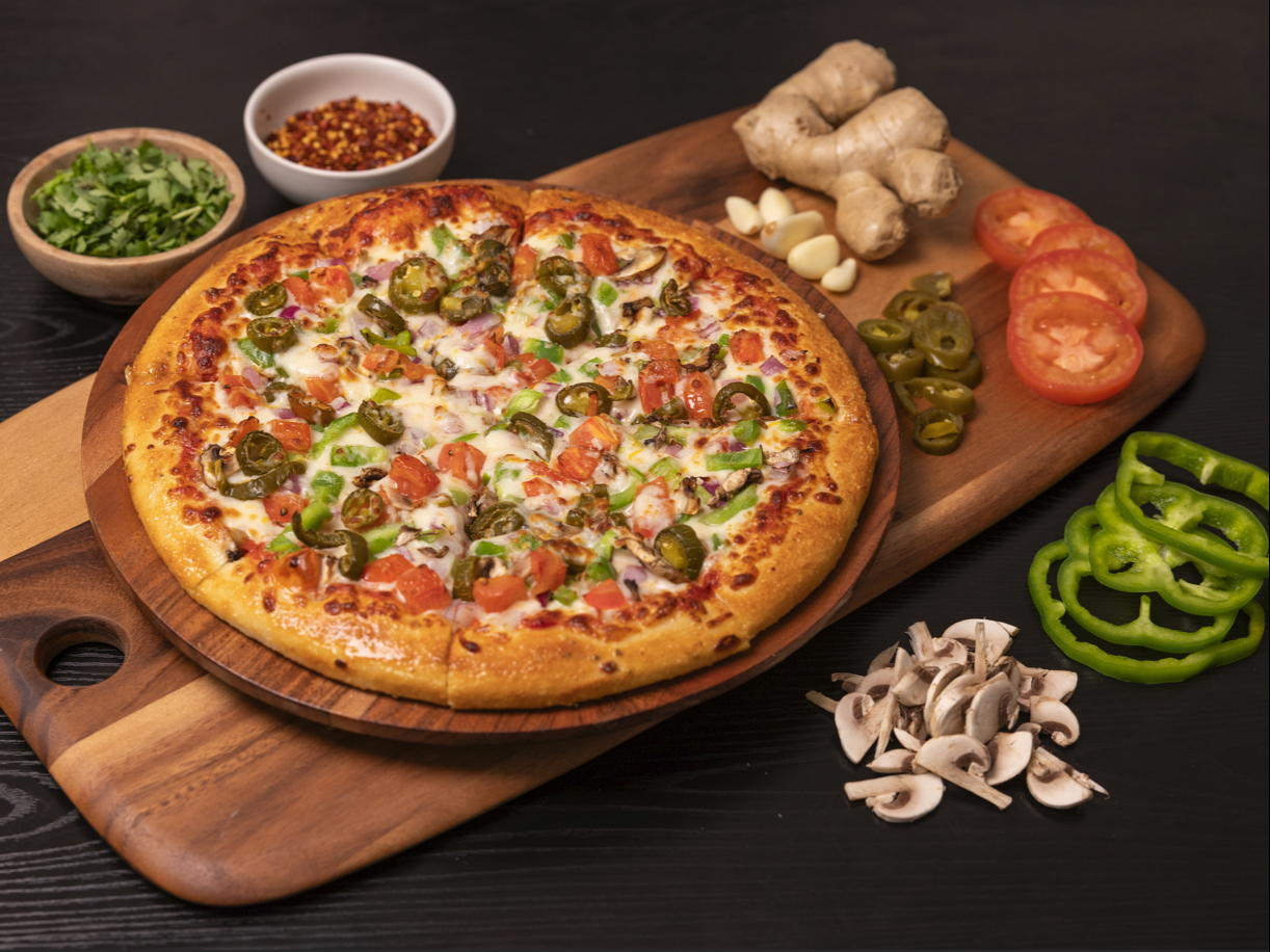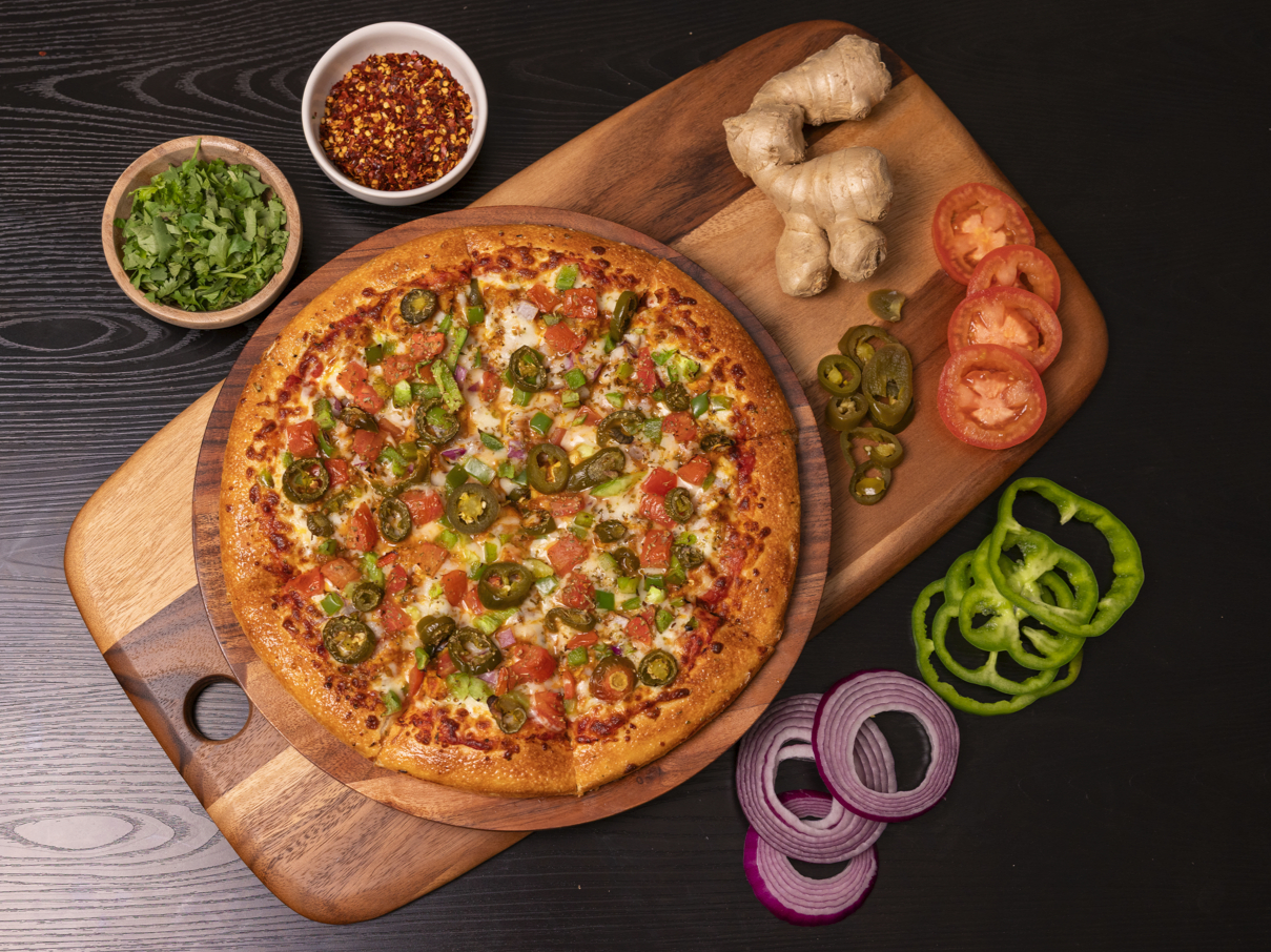 Pizza sauce, red onions, mushrooms, garlic, ginger, green peppers, tomatoes, jalapenos, cilantro & mozzarella cheese.