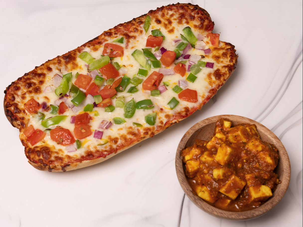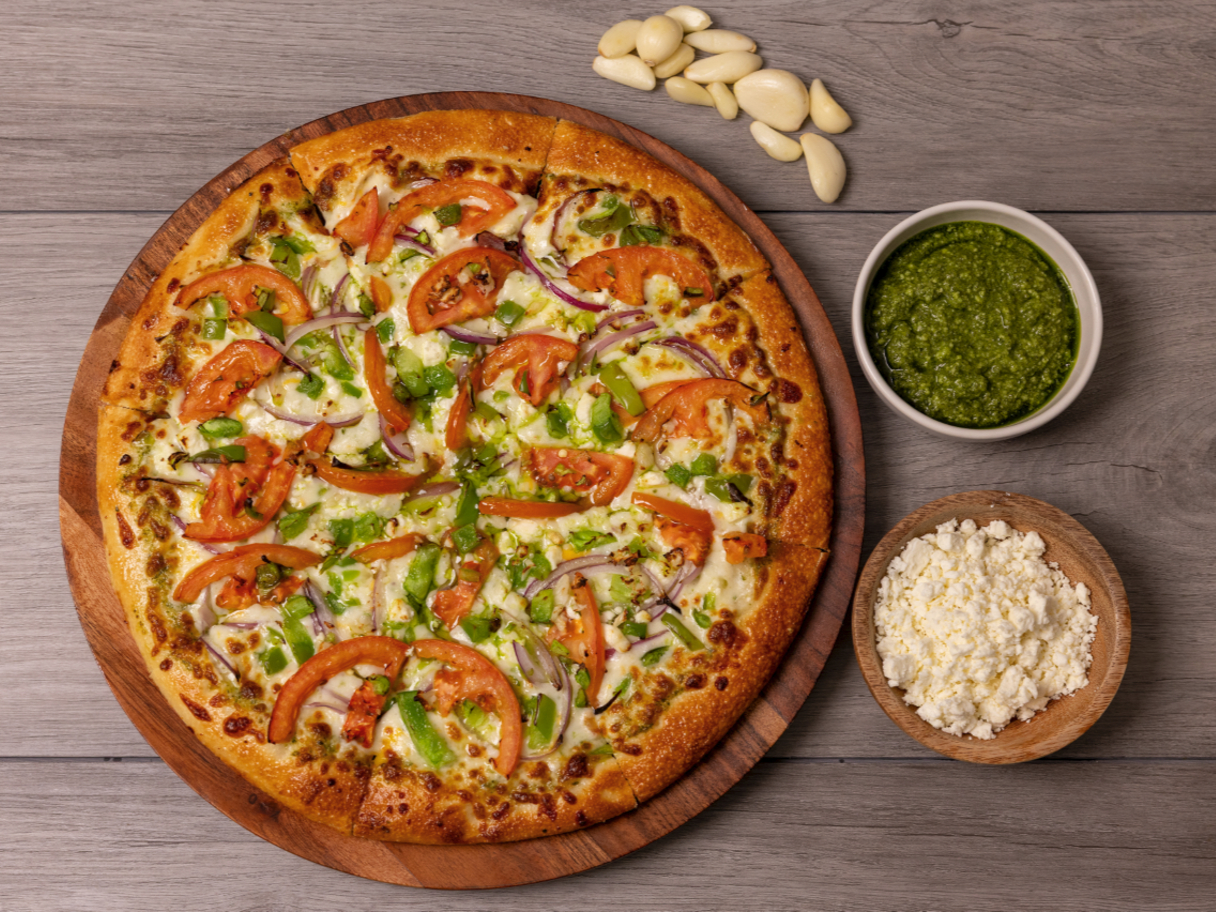 Pizza sauce, Butter paneer, red onions, green peppers, tomatoes & mozzarella cheese.