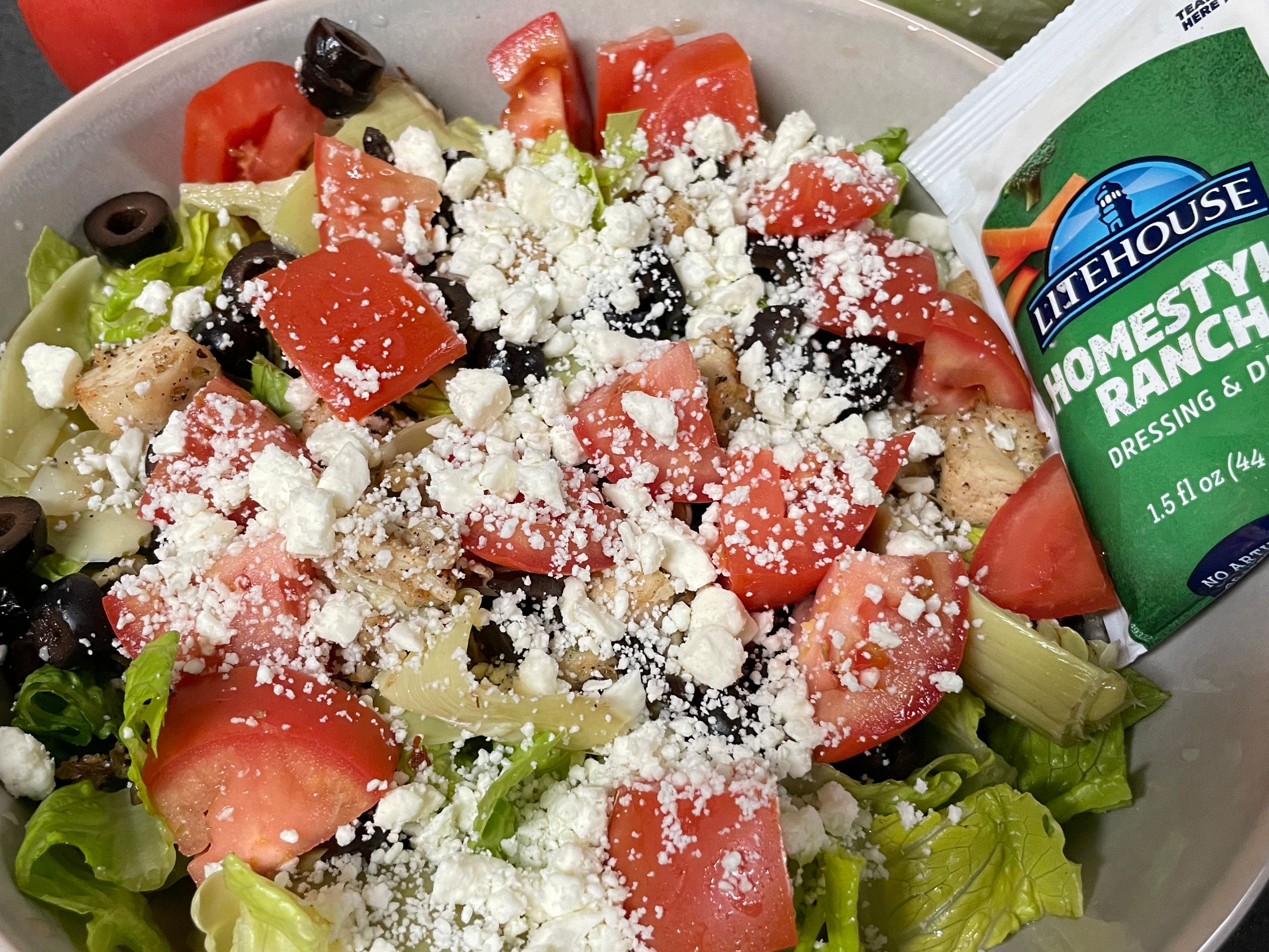 Fresh lettuce, red onions, green peppers, cucumber, tomatoes, kalamata olives, olive oil & feta cheese topped with sprinkle of oregano.