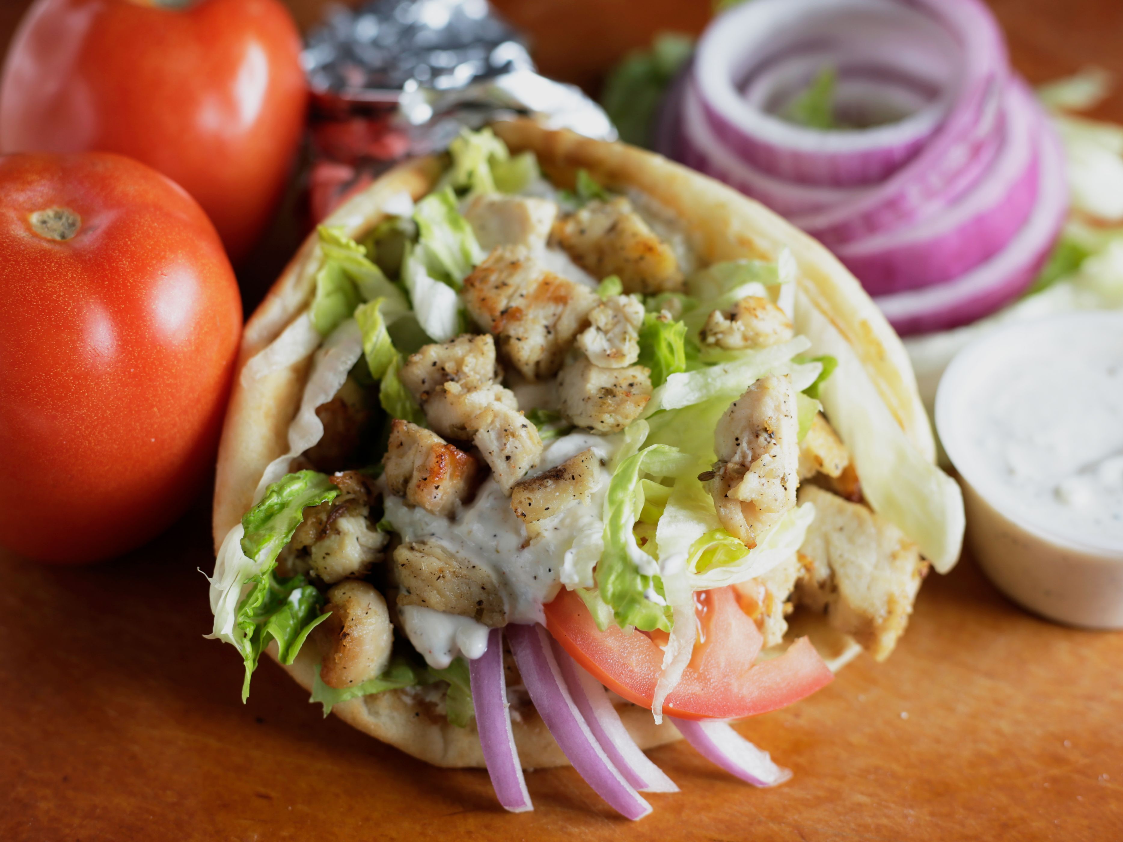 pita bread, red onions, tomatoes, lettuce, halal chicken with tzatziki sauce